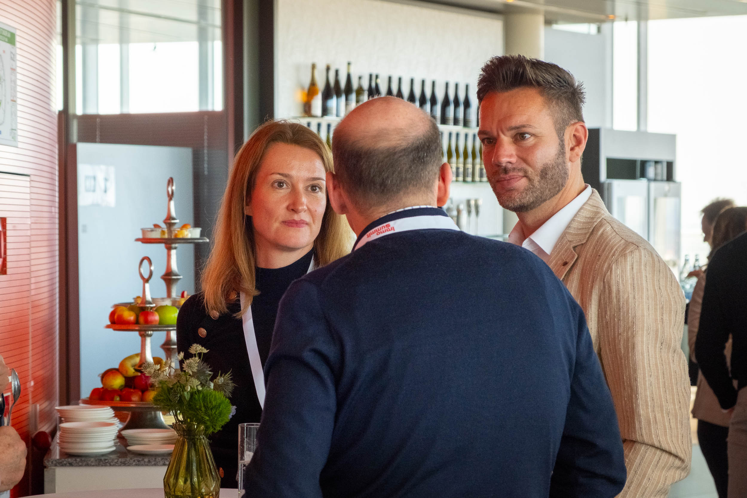Empfang im 27. Stock des KölnTriangle-Turms. Nutzen Sie die Gelegenheit für einen Kaffee, frische Croissants, Joghurt und Obst und nehmen Sie entspannt Ihren Platz ein.